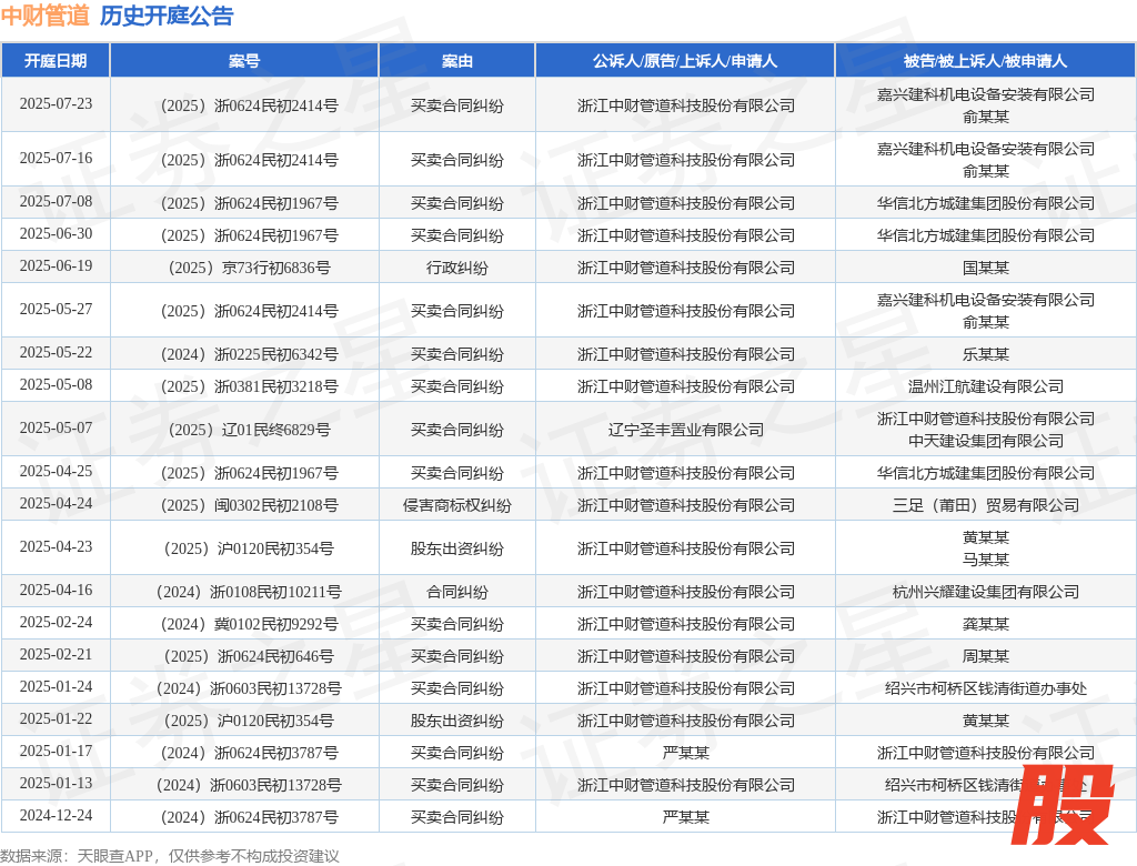 案号:(2025)京73行初6836号审理法院:北京知识产权法院案由:行政纠纷当事人信息: 原告/上诉人:浙江中财管道科技股份有限公司 被告/被上诉人:国某某开庭日期:2025年6月19日根据统计,近一年内以浙江中财管道科技股份有限公司为当事人的历史开庭公告有41则,其中案由为“买卖合同纠纷”的公告以26则居首,其次为“合同纠纷”有3则,“销售假冒注册商标的商品罪”有3则。历史开庭公告(前20条)如下: