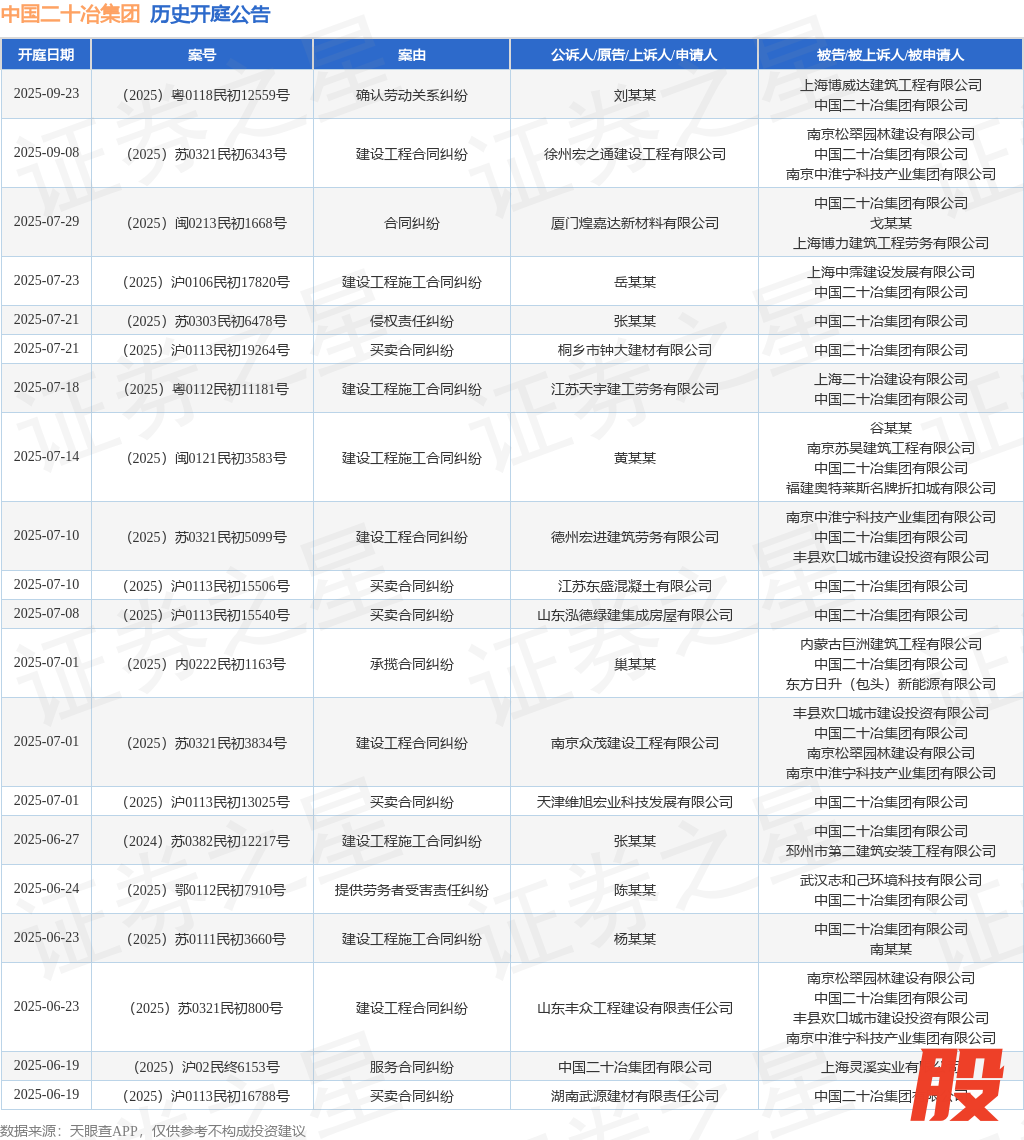 案号:(2025)沪02民终6153号审理法院:上海市第二中级人民法院案由:服务合同纠纷当事人信息: 原告/上诉人:中国二十冶集团有限公司 被告/被上诉人:上海灵溪实业有限公司开庭日期:2025年6月19日根据统计,近一年内以中国二十冶集团有限公司为当事人的历史开庭公告有350则,其中案由为“建设工程施工合同纠纷”的公告以62则居首,其次为“建筑设备租赁合同纠纷”有49则,“买卖合同纠纷”有47则。历史开庭公告(前20条)如下: